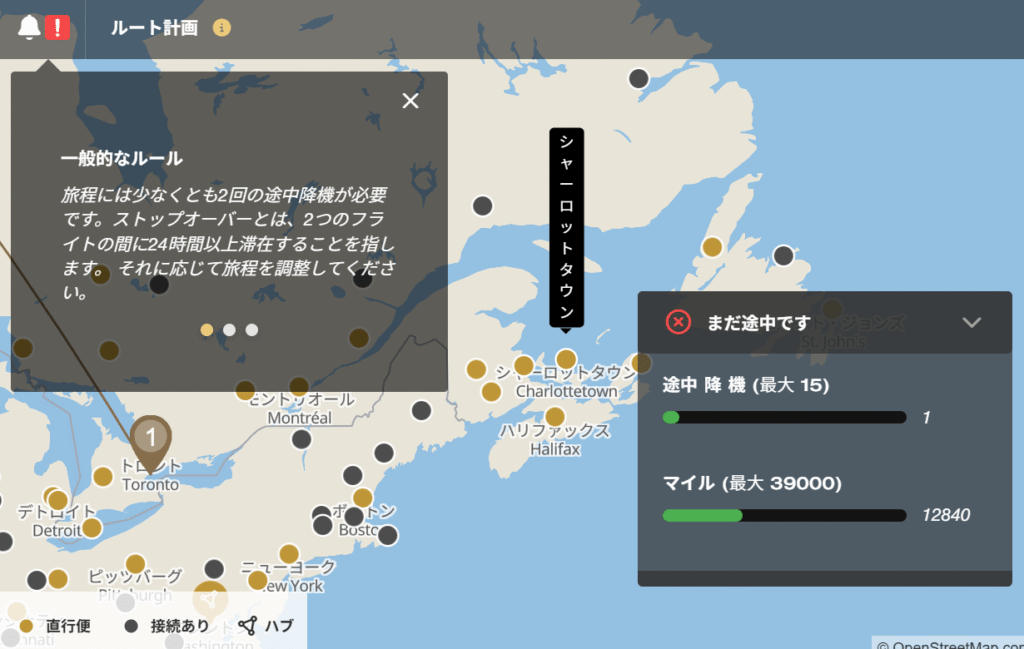 画面上には、最低限クリアしないといけないルールが表示され、選んだ空港に直行便があるかどうかも表示されるようになりました。
