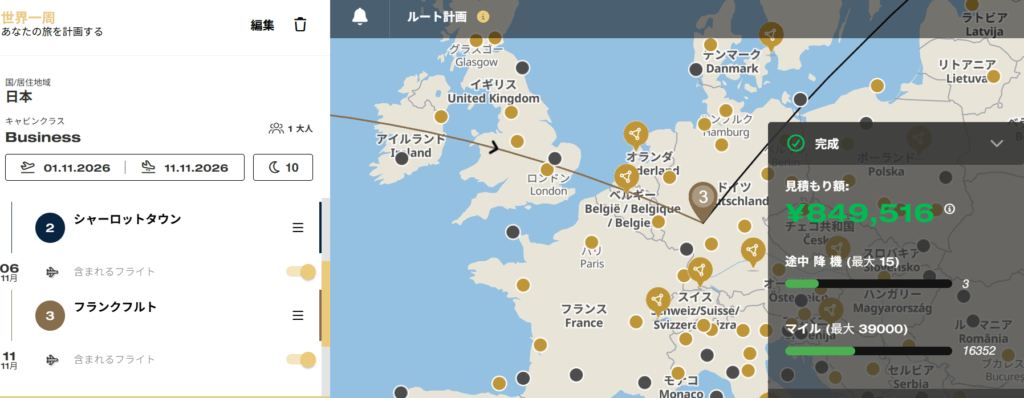 あとは、都市と出発日を選んで旅程を組んでいくだけです。大陸すべてを通る必要はありませんが、ルートは東回り、あるいは西回りのどちらかで移動します。逆回りはできません。一方通行になるかどうかは、とりあえず旅程を組んでみて、エラーが出なければOKです。