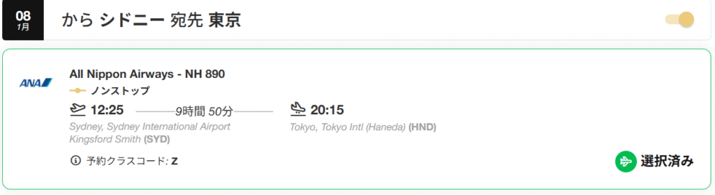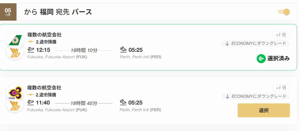 一部のフライトが、エコノミークラスの席しかないようです。エコノミークラスにダウングレードされても運賃は変わりません。なので、目的地を変更することにしました。