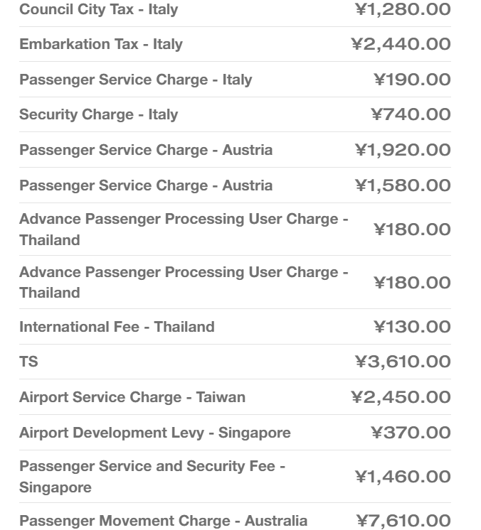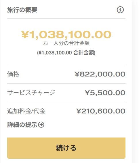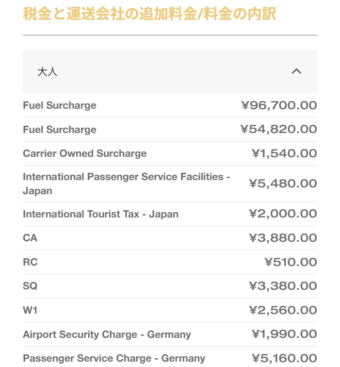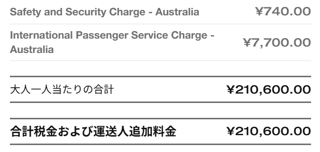 「次へ」をクリックすると、燃油サーチャージや空港使用料、税金などが加算された値段が表示されます。
