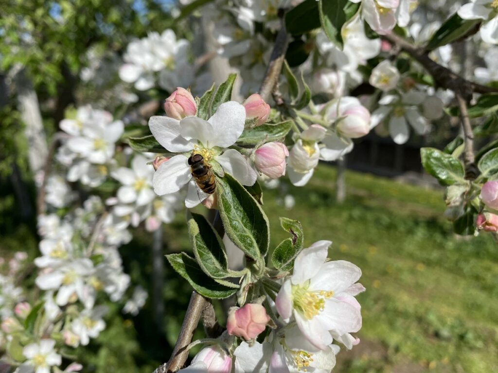 ちょうど、和りんごの花に、ハチがとまっていました。このハチは「マメコバチ」。「ミツバチ」より小さなハチです。針をもっておらず、りんごの受粉の手伝いする安全で働き者のハチだそうです