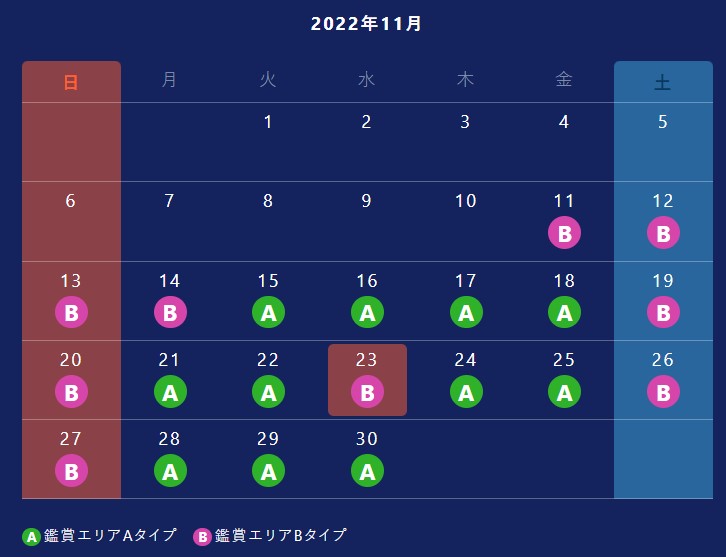 有料、もしくは当選した場合の鑑賞エリアは、ハーバー全体が見渡せる場所です。毎月25日頃に、翌月分のカレンダーが更新されます。