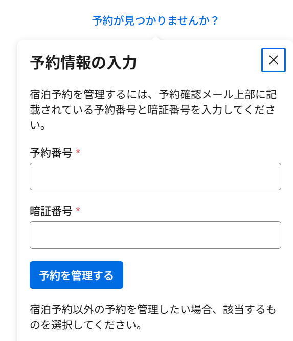 予約が見つからない時に利用するようで、普通に予約を見るときには使いません。また、管理画面で削除した予約に関しては、送られてきた予約番号やPINを入れても表示されませんでした。