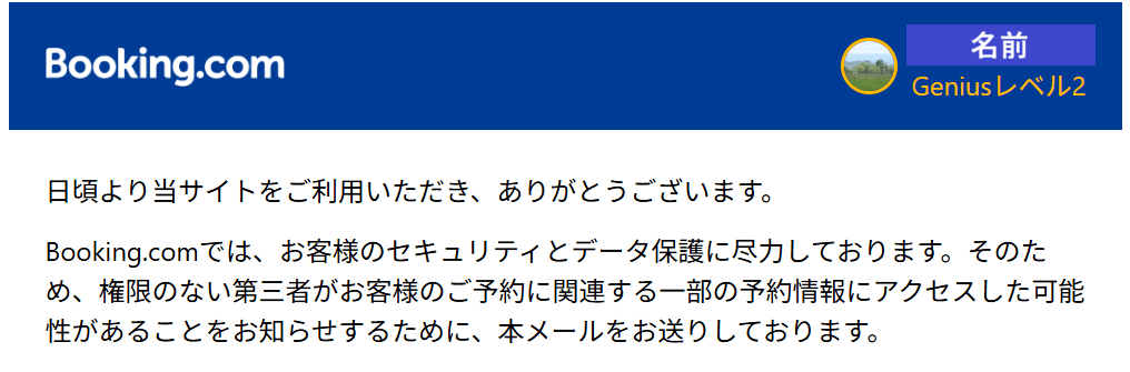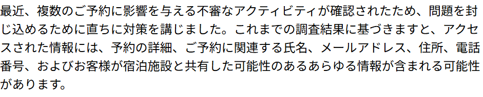 内容は、世界最大級のオンライン旅行予約プラットフォームであるBooking.comが、第三者による不正アクセスを確認して、対策を講じるというものでした。その対策とは、既存・過去の予約に紐づくPINを強制リセットし、影響を受けたユーザーへの個別通知を行うというもの。私の予約もその対象となっているようです。