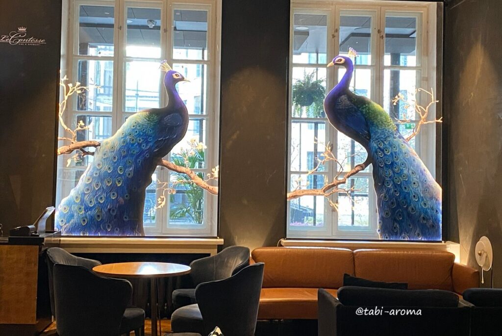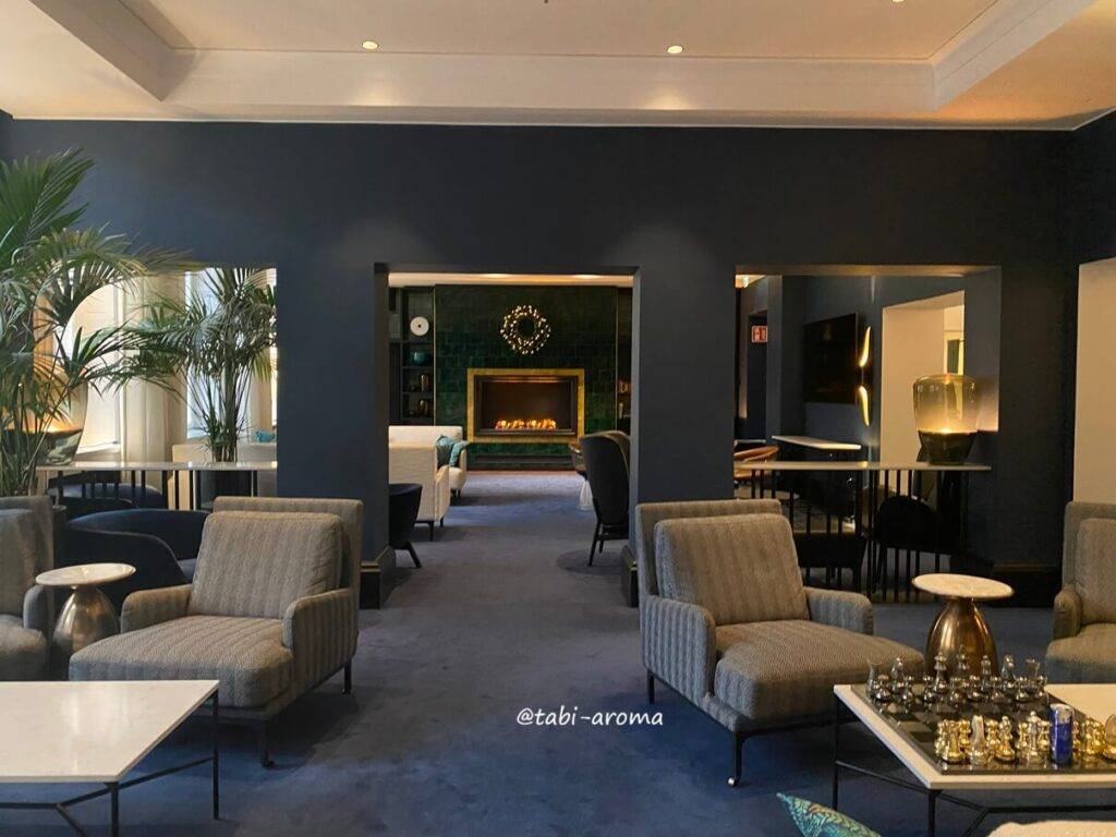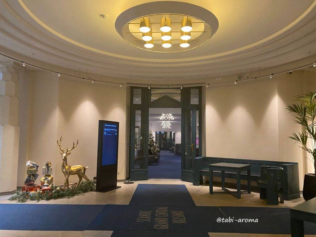 レセプションとレストランへ続く通路の間に、ホテルの正門(エントランス)があります。少し早く行ったのでレセプションの前にあるラウンジで時間つぶし。
