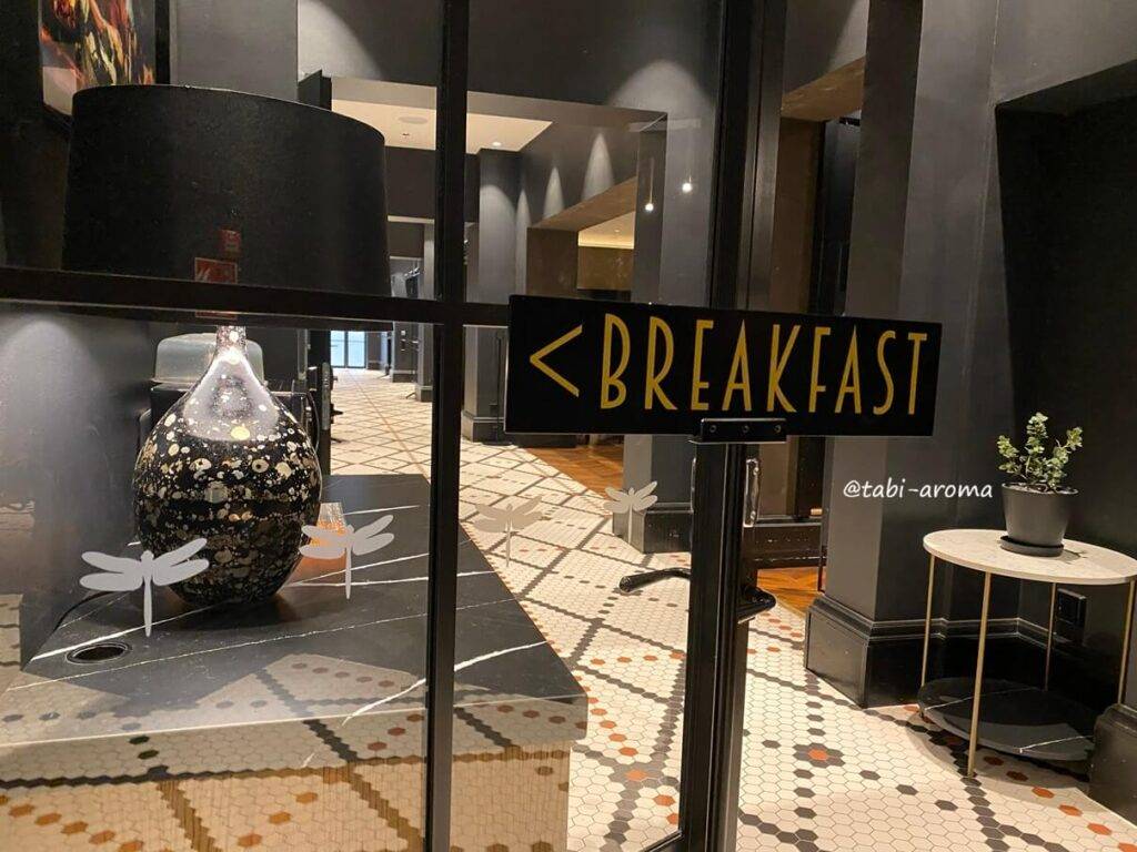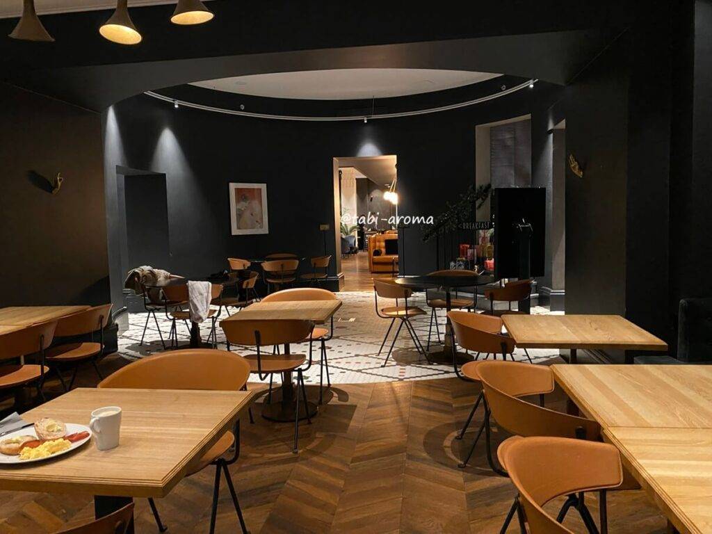 夜にはバーになる空間を通り過ぎて、朝食のレストランへ進みます。