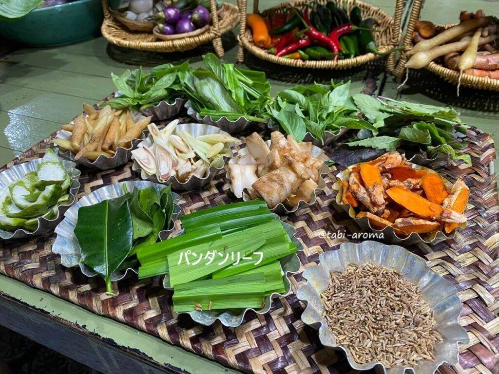 (上の写真の)鮮やかな緑色の葉は、パンダンリーフというハーブです。香り付けとして使用され「ニオイタコノキ」や「東洋のバニラ」とも呼ばれています。