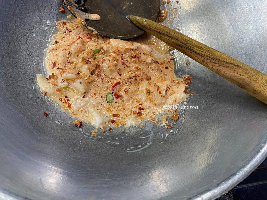 チキンが入っているフライパンに、一気に材料を投入します。強火で炒めているところに、先生がココナッツミルクと海老を入れてくれ、さらに炒めます。
