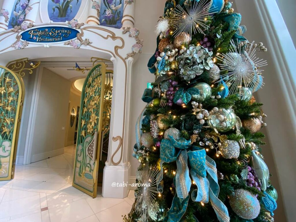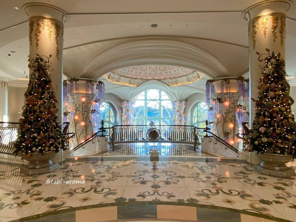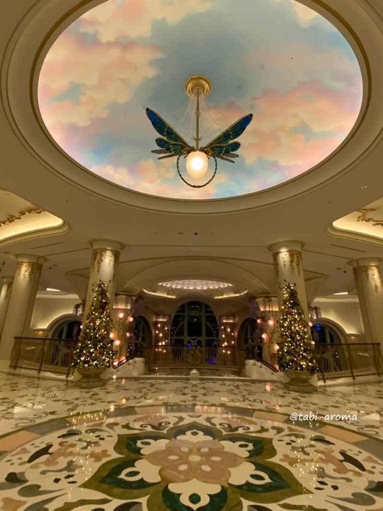 エントランスは、クリスマスツリーがたくさん飾られ、夢の国にふさわしい様相を呈していますね。荷物をベルデスクに預け、しばし写真タイム。まだ人が少ない時間帯だったので、きれいな写真が撮れました。