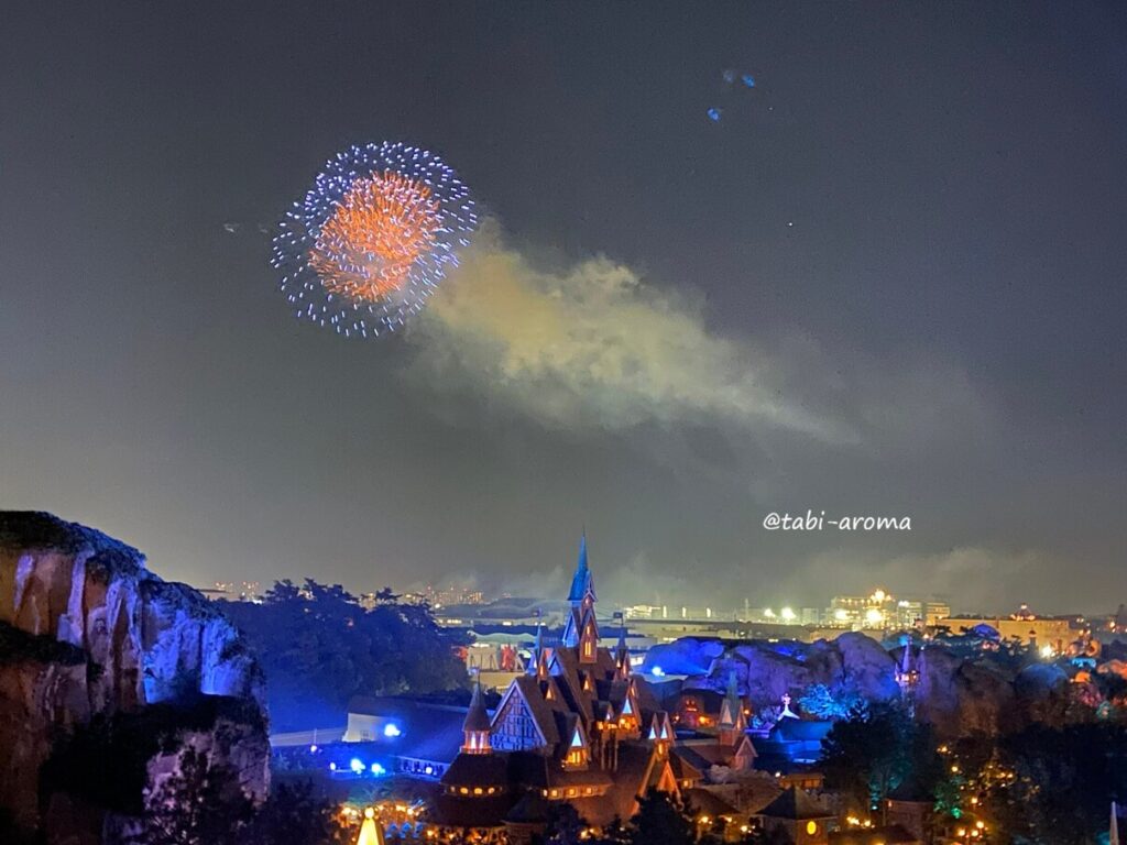 部屋の窓からは、音楽は聞こえませんが、ホテルミラコスタのプロジェクションマッピングや花火が見えました。