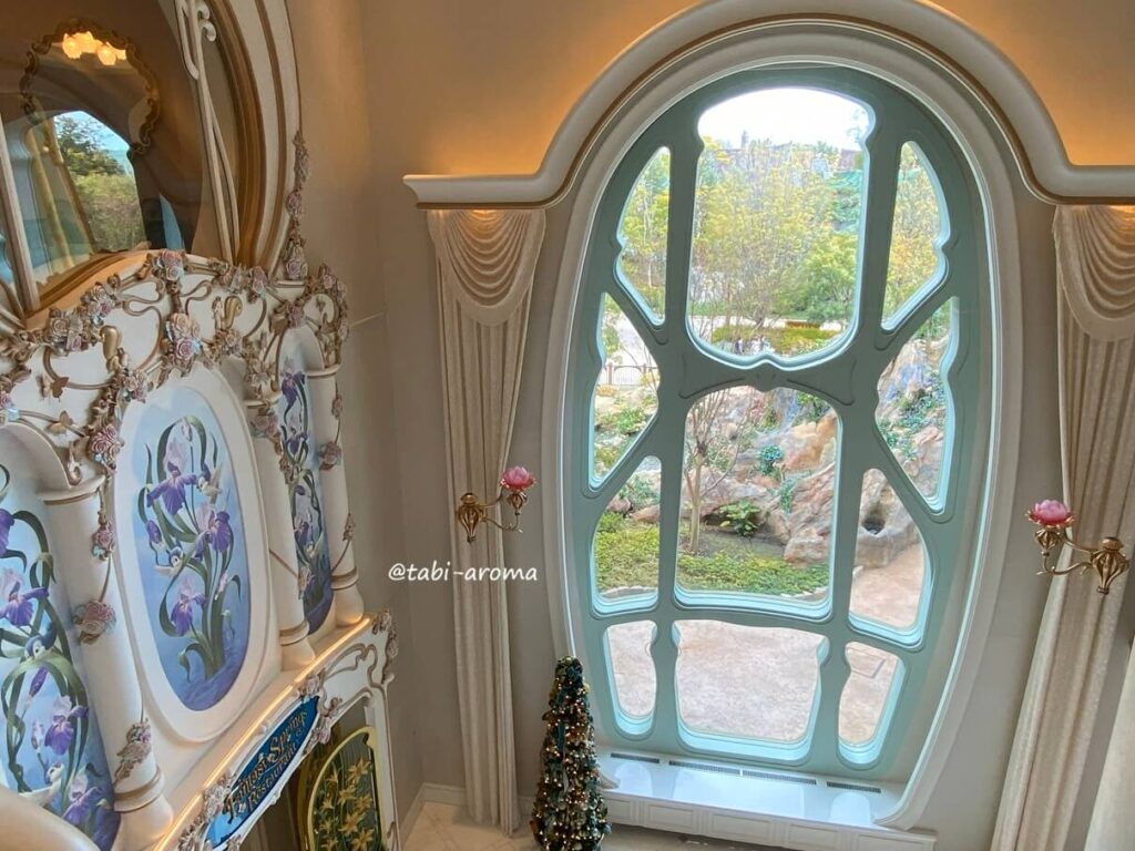 特別な朝の景色を楽しめるのも、ファンタジースプリングスホテルのほんのわずかな部屋に泊れた最高の特典。窓ガラスは、ほんの少し開けることができますので、パークの音楽や鳥の声を聞くことができます。