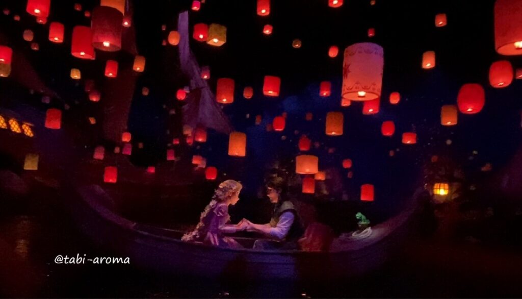 天気のいい早朝ならではの爽やかな空気を感じながらゆっくり散策したいのですが、せっかく早く入れたのなら一つでも多くのアトラクションにも乗りたいですよね。この日は、アナ雪のアトラクション「アナとエルサのフローズンジャーニー」はシステム調整で休止(途中で復活したようですが)、「ラプンツェルのランタンフェスティバル」に並びました。