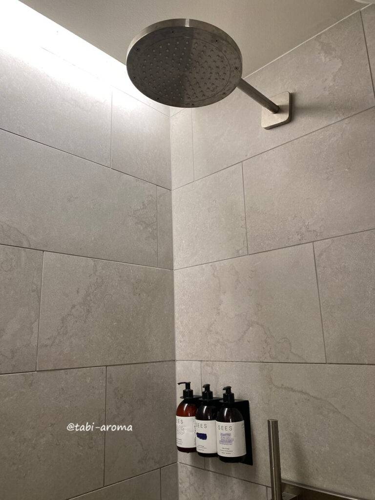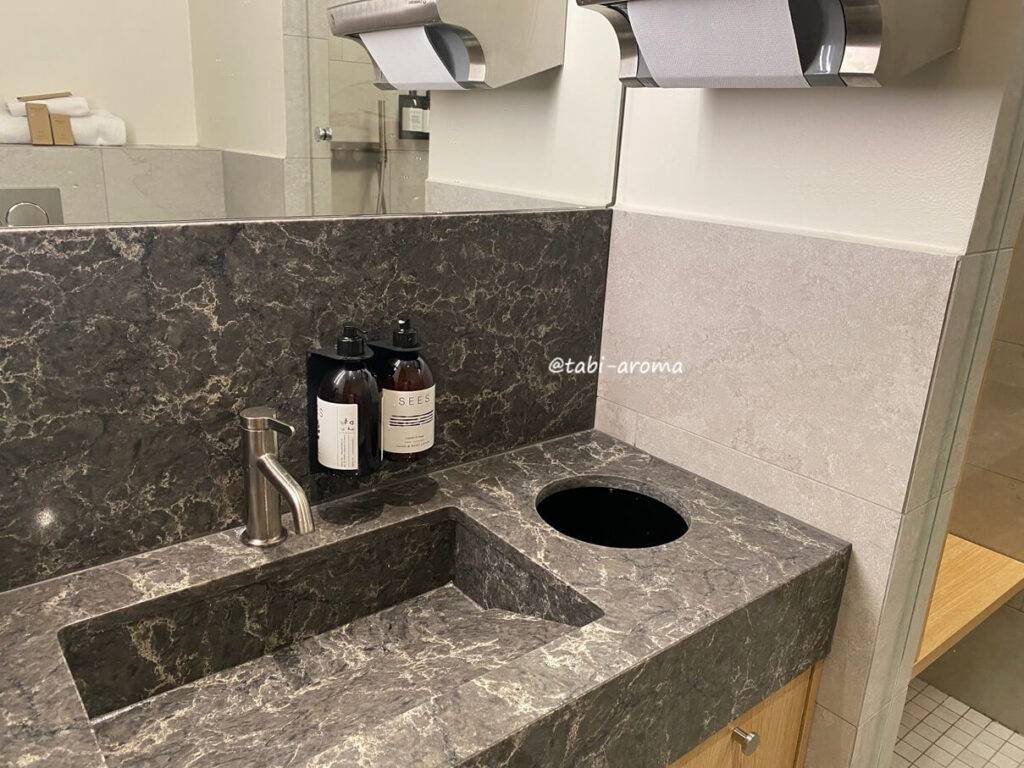 シャンプーやコンディショナー、ボディソープが用意されており、全て機内と同じSEESでした。