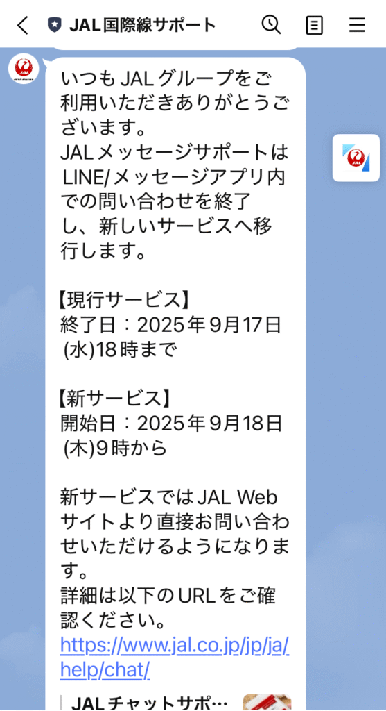 ところで、2025年9月18日(木)より、LINEでのサービスが終了して、JAL Webサイト上で直接チャットによる新サービスが始まります(と教えてもらいました)。今回のように「予約したいのに電話が通じない!」という問題が解決されそうです。
