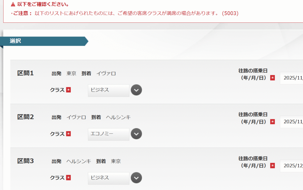 上記の旅程が組める航空券を、JALの公式サイトで検索してみました。フィンエアーでもほぼ同じ値段でしたが、JALだとポイントサイトの「楽天リーベイツ」を通してポイントが付くからです。金額が大きいので、1%のポイントでも数千円分になります。