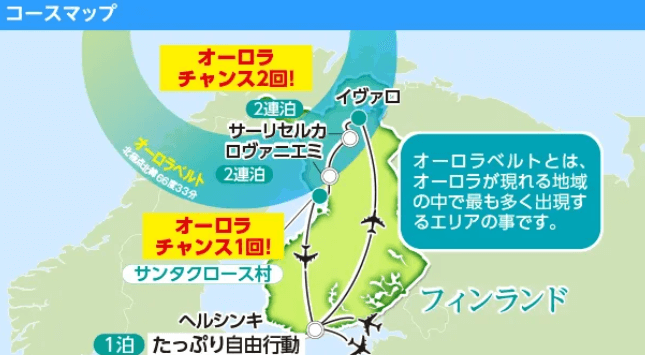 いろいろ調べた結果、オーロラベルト直下のラップランドの町、「サーリセルカ」か「イナリ」の2カ所がおすすめらしいです。