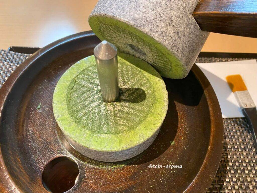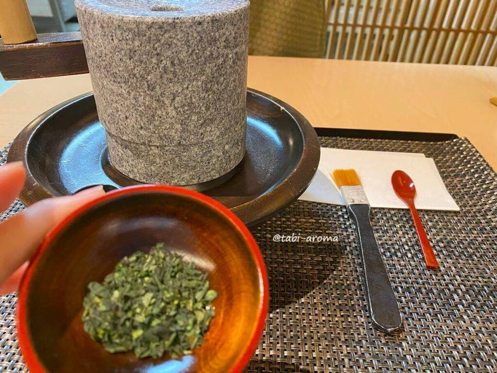 甜茶(てんちゃ)を石臼に広げ、反時計回りに30回、石臼を挽きます。スタッフの方が動画を撮ってくれました。どこまで宿泊者を喜ばせるのでしょうね。