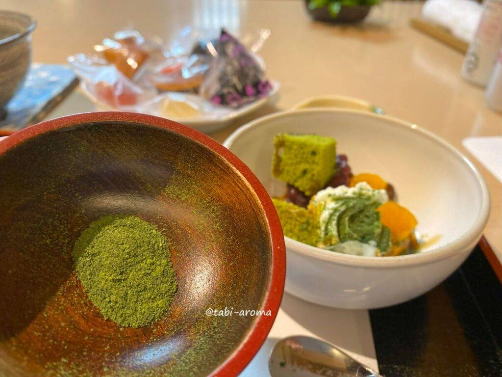 10時からは、石臼で挽いた抹茶をかけたあんみつがいただけます。