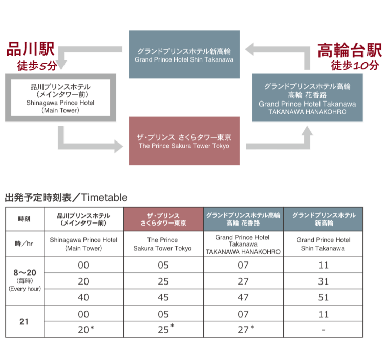 8時から20時までは20分毎に運行しています。品川駅からは品川プリンスホテルからシャトルバスに乗った場合、2つめで降りればいいようです。