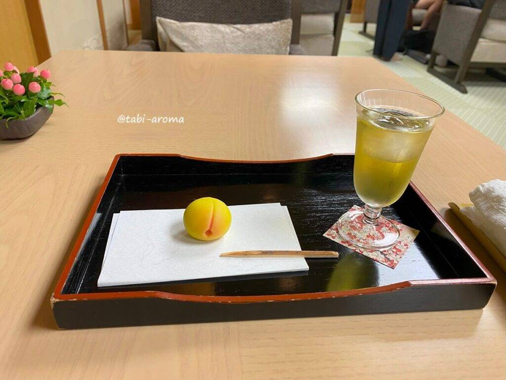 15時ごろに着いた時、数組がチェックインされており、少し待つことになりました。ただし、ラウンジで飲み物やスィーツがいただけるので、何の問題もありません。この日のウエルカムドリンクは冷茶、梅の和菓子が添えられていました。