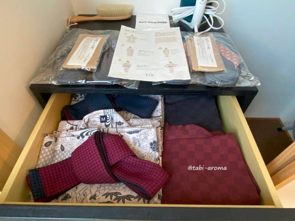 引き出しの中には、浴衣やパジャマ(ワンピースタイプ)が用意されています。セパレートタイプのパジャマは、リクエストすれば持ってきてもらえます。