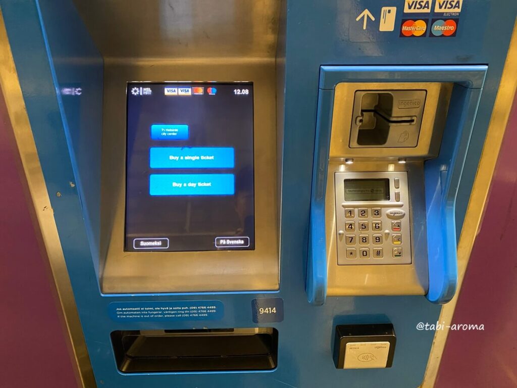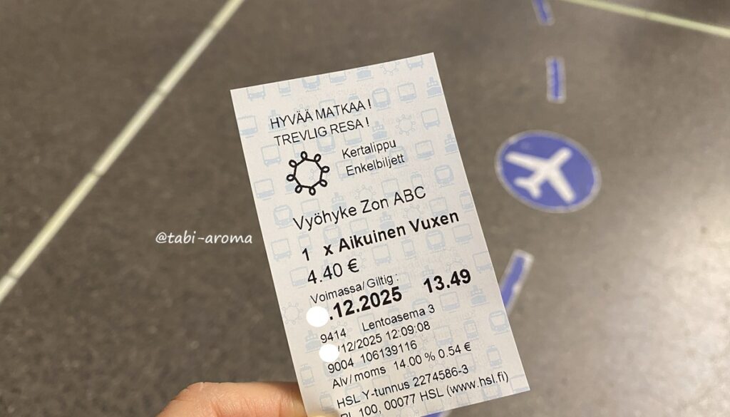 チケットは、乗車前に券売機購入できますが、HSLの公式アプリや車内でも買えるようになりました(2026年1月現在)。公式アプリをダウンロードして、クレジットカードを登録しておけば、電車だけでなく、トラム・地下鉄・バス・フェリーのチケットが現地で簡単に買えます。