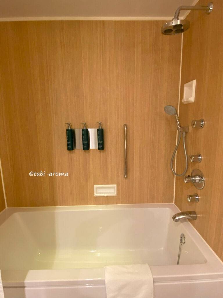 写真ではあまり感じませんが、浴槽はかなり大きく、165㎝の私が足を伸ばしてゆっくり浸かれる大きさで、かなり快適でした。
