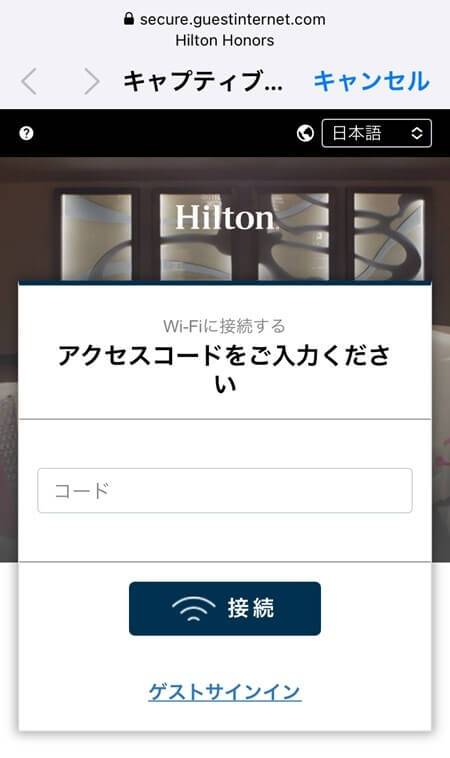 ヒルトン会員特典でいただいたパスワードを入れて利用します。
