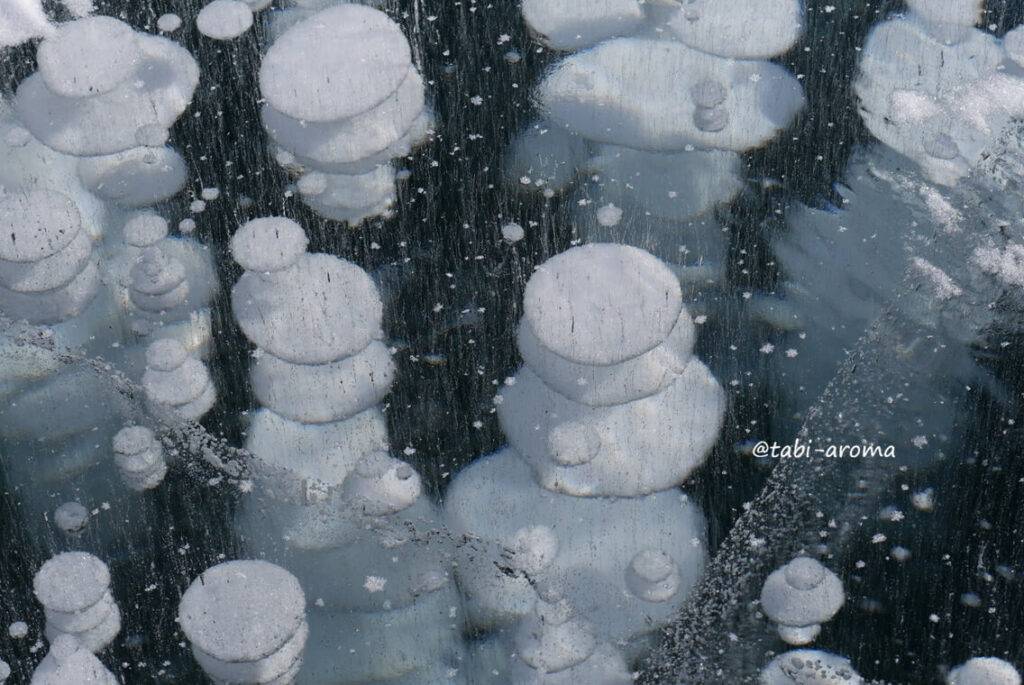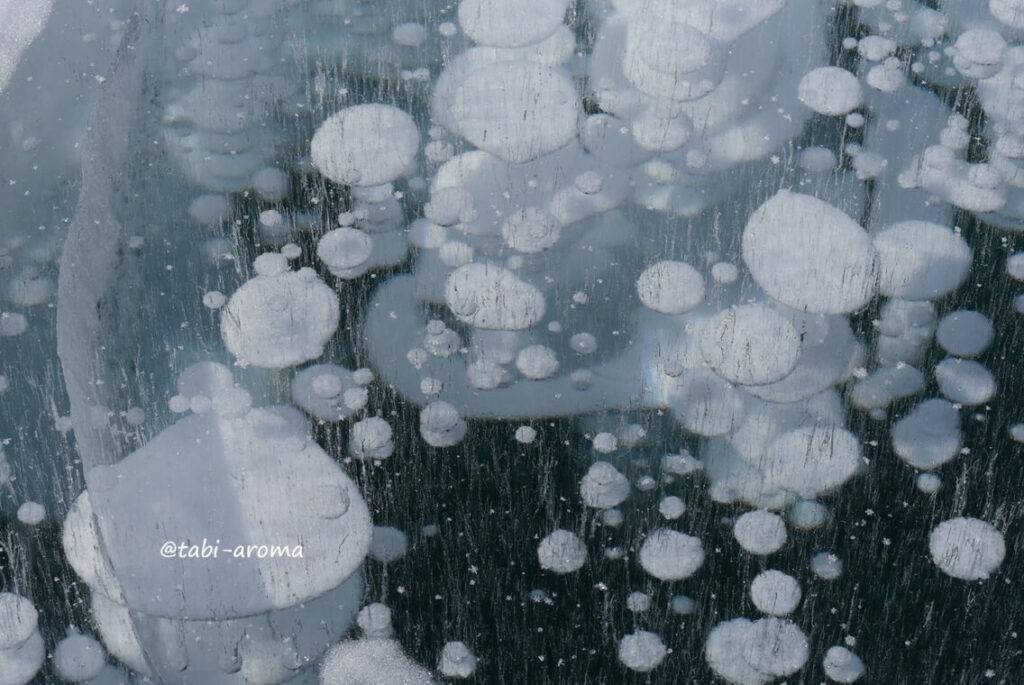 1年中湖底の植物から発生しているメタンガスが、湖面にたどり着く前に凍り付いてできる姿を見ることができます。白い無数の気泡が氷の中に閉じ込められた様子が足元に広がります。