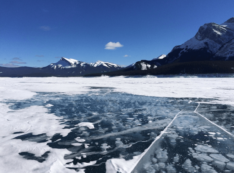 アイスバブルとは、カナディアン・ロッキーのいくつかの湖で冬に見られる美しい自然現象です。気泡の数や重なり方によって、さまざまな模様が見られ、近年注目度が上がっているそうです。