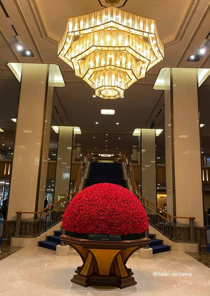 季節ごとに楽しませてくれる本館ロビーの装花。冬は、約1,000輪ものプリザーブドフラワーのバラを使用しているとか。圧巻でした。