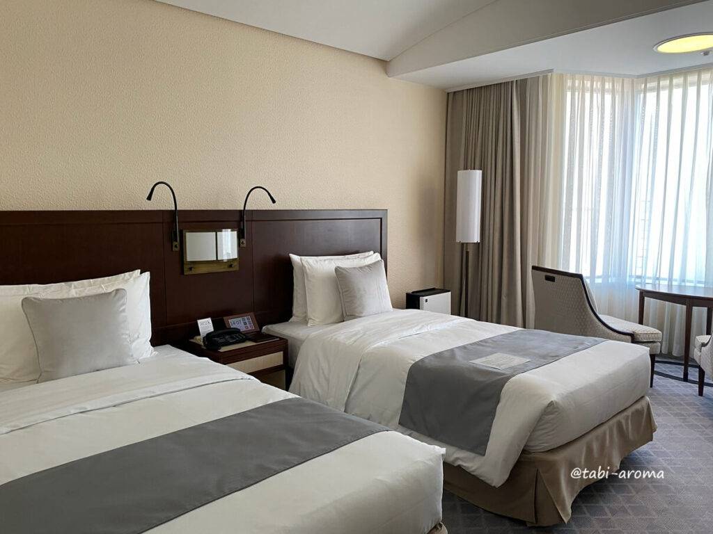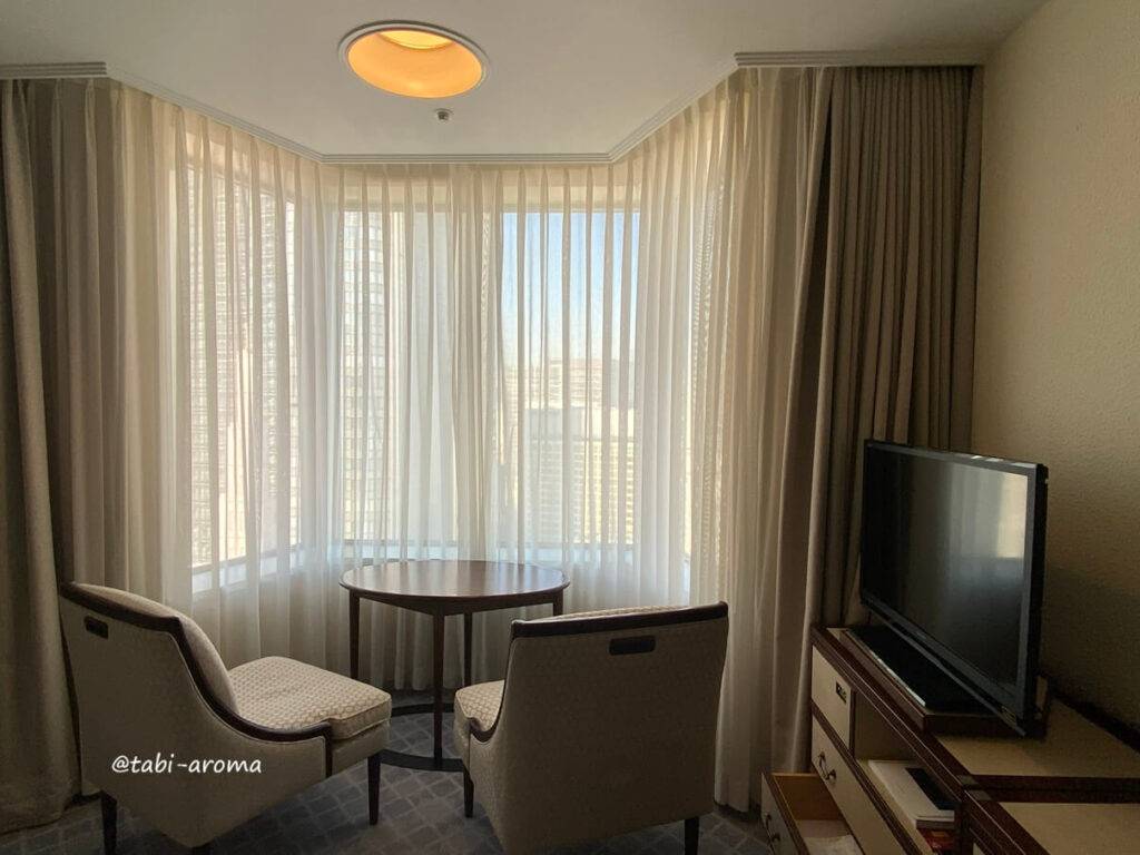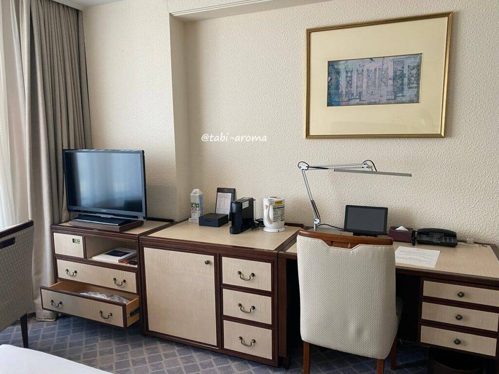 テレビは少し小さ目で、下の台がほとんど動かないので、壁際のベッドからは見にくい状態でした。広さだけ見ると、都内のラグジュアリーホテルとは呼ぶにはやや控えめです。東京ステーションホテルと同じくらいの広さだったので、歴史のあるホテルの部屋のサイズということでしょうか(勝手に想像)。
