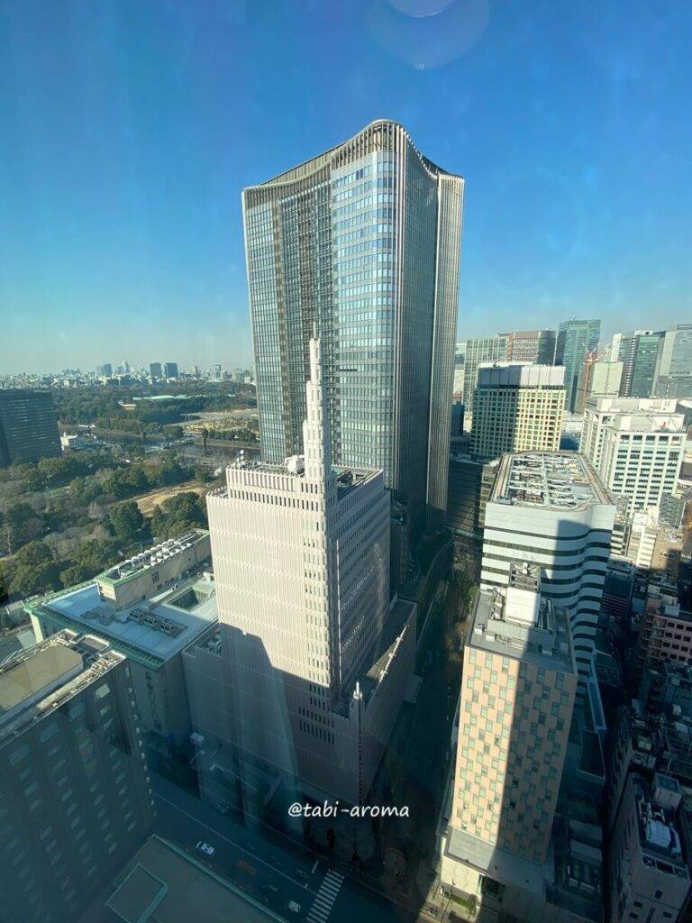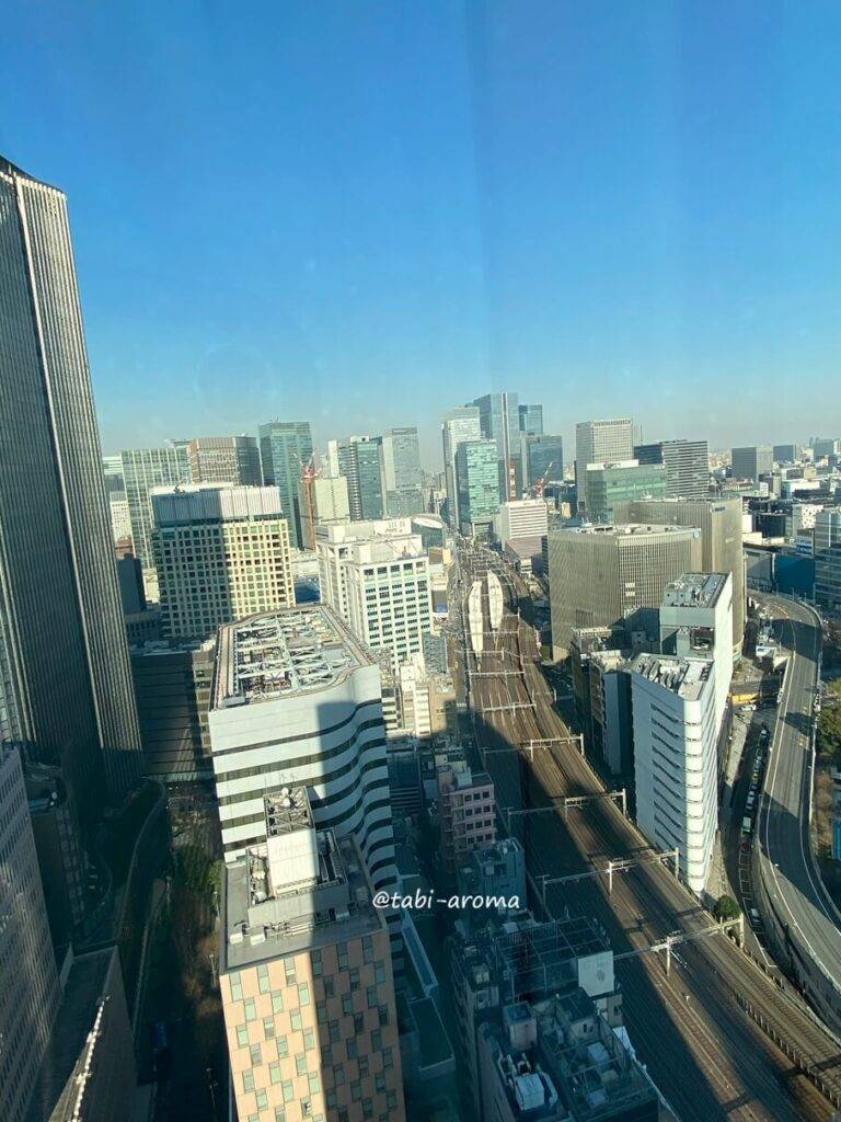 「可能な限りで景観のいい部屋を」とお願いしていたのですが、左には皇居、右下には有楽町駅。