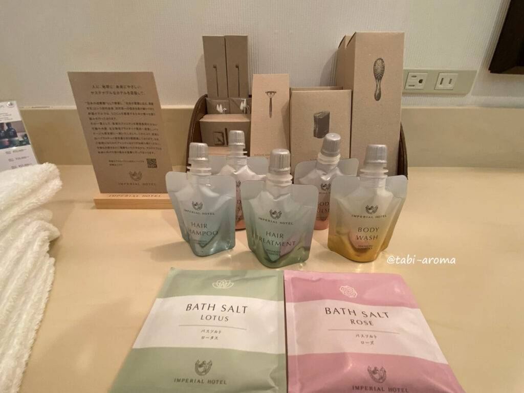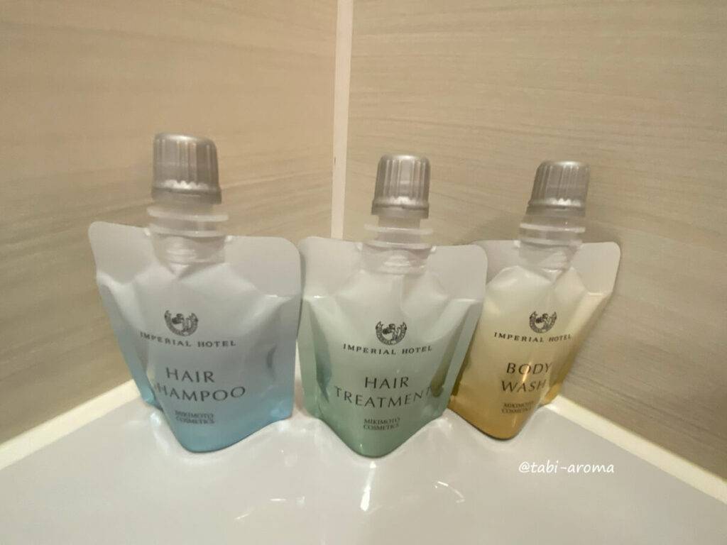 バスアメニティは、個別包装のもの。使い心地もよかったです。MIKIMOTO COSMETICSの帝国ホテルオリジナルパッケージとなっています。