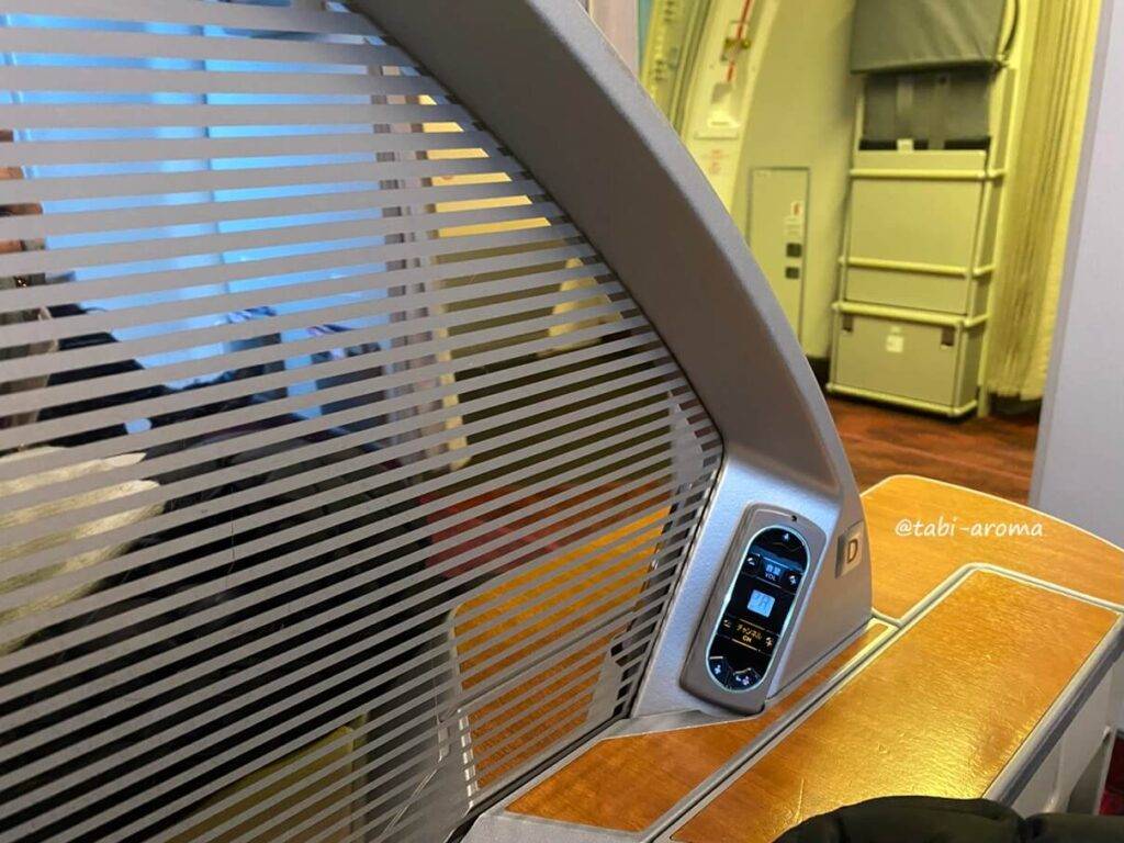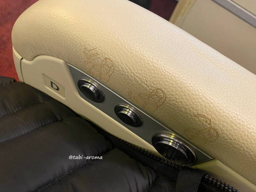 足元はかなり広めで、王様気分を味わえる席です。上の棚は、両側に一つずつあり、どちらを使ってもいいようです。