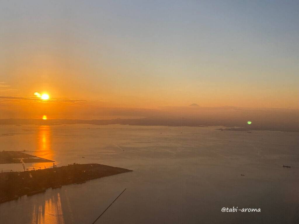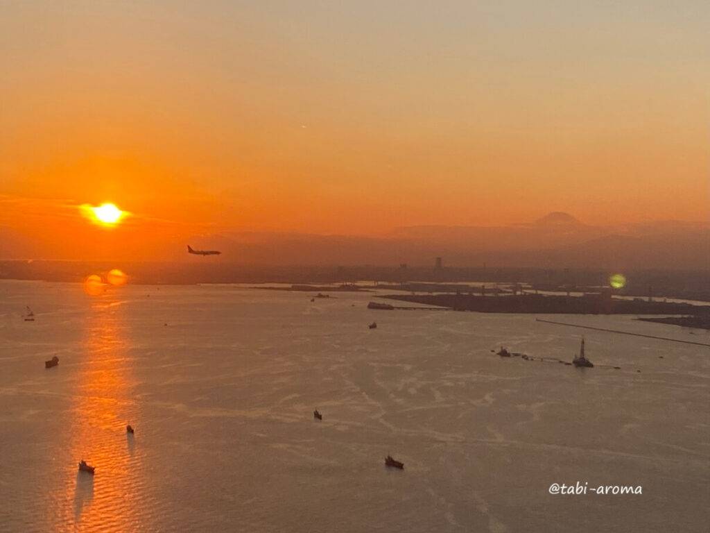 しばらくは雲海を見ながら飛行。山々の紅葉を見ながら、羽田空港へ向かいます。ちょうど、夕日がきれいな時間帯。