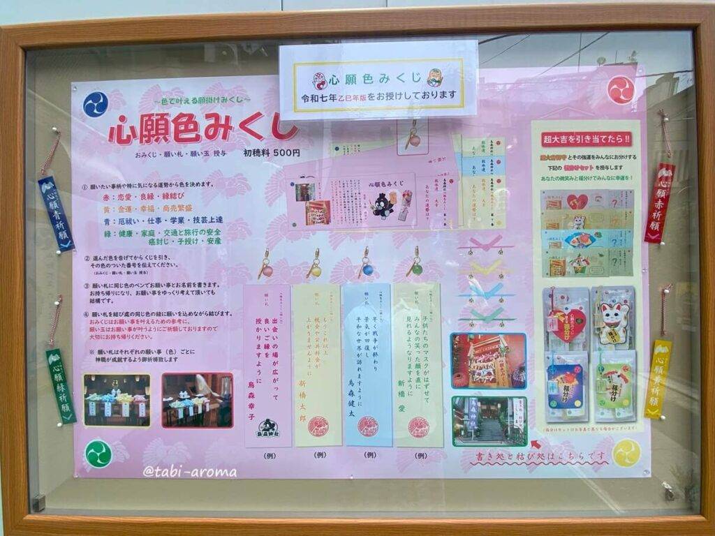 烏森神社のおみくじは、占うことにより4色に色分けされた、色で叶える「願掛けみくじ」です。おみくじ・願い札・願い玉の3点からなっています。