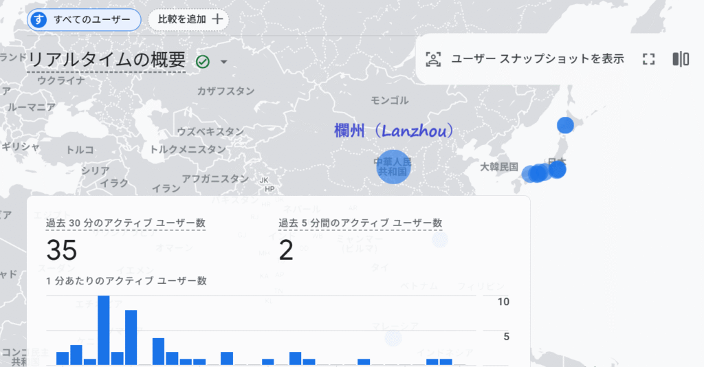 画面の上部にある「比較を追加+」をクリックして、「新規作成」から「Lanzhou」を入力すると、下の写真のように実際に記事を見ていただいている真っ当なアクセスだけを表示できます(異常なアクセスを排除)。