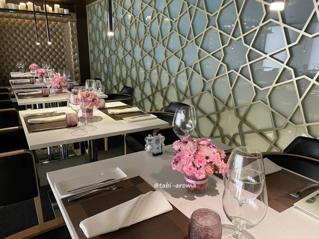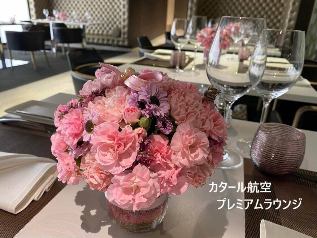 テーブルにお花が置かれ、水のグラスが Q suite(機内のビジネスクラス)と同じ仕様になっています。