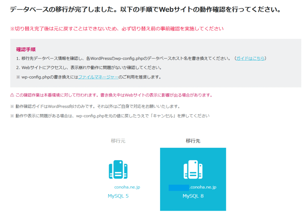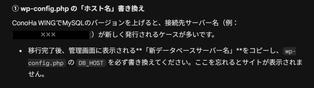 説明にはデータベースホスト名の書き換え方法のガイド(リンク)もあるのですが、書き換えのタイミングが分かりませんでした。これが不具合発生の原因ですね。ConohaWINGの説明って(初心者には)分かりにくい言い回しが多いのです。いや、私が知らなすぎるのか?