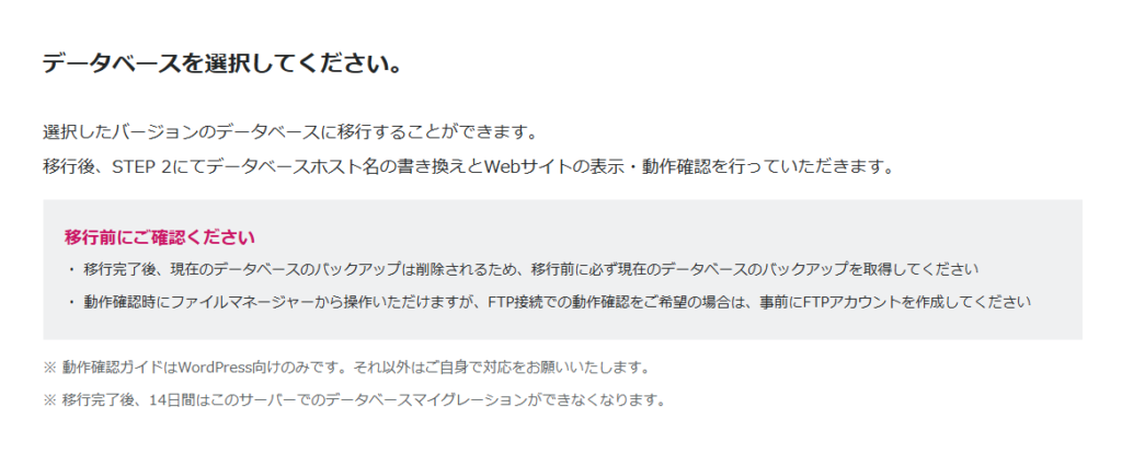 「データベースの移行」と「切り替え」の違いが分かっていませんでした。また、この画面から離れてはいけないと思っていたので、事前確認をメモして「次へ」。