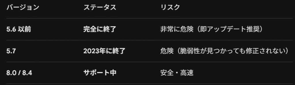 Geminiさんによると、MySQLのバージョンが古いまま使い続けることには、「見えないリスク」が潜んでいるそうです。家で例えるなら、「古くなって鍵が壊れやすくなり、隙間風も入るけれど、修理パーツがもう売っていない状態」に似ています。具体的にどのような問題が起こるのか、考えられるリスクも教えてくれました。
