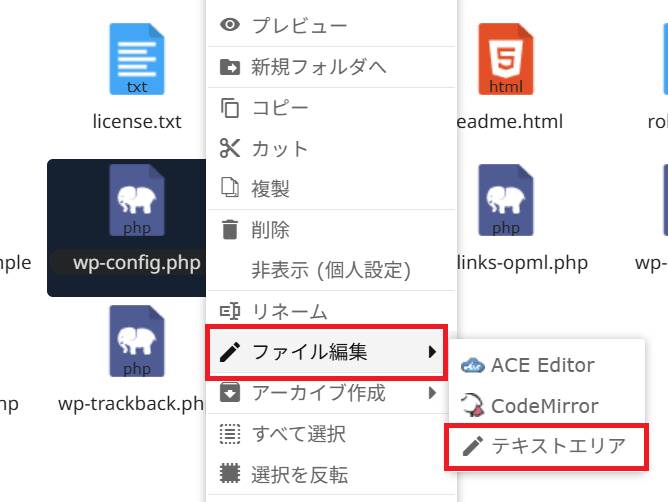 確認するのは、ファイルマネージャーの中の wp-config.php です。