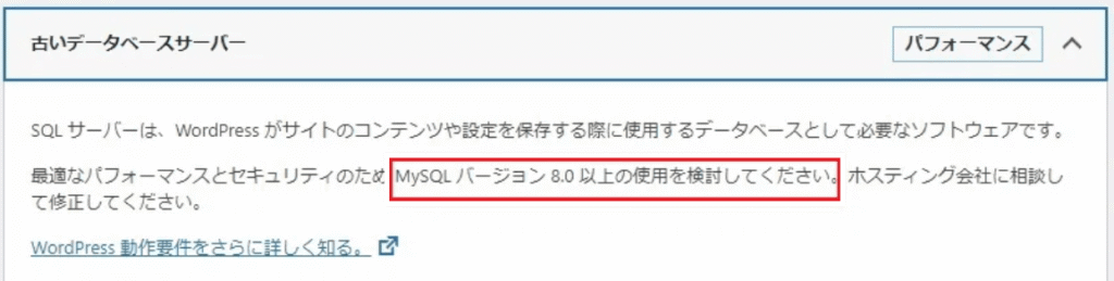 悪戦苦闘しましたが、無事、WordPressのサイトヘルスから「古いデータベースサーバー」という警告は消えました。