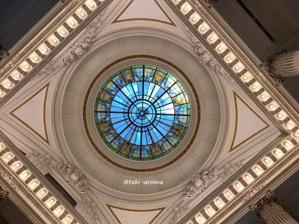 ローマドーム式の天井には高さ約16.5mのステンドグラスが設けられています。