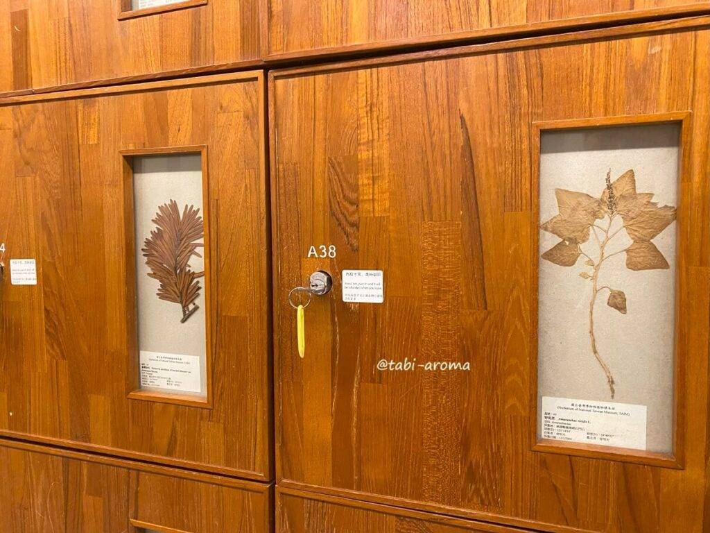 入口には木製のロッカーがあり、様々な押し花が飾られています。使用料は10台湾ドルですが、使用後にお金は戻ってきます。