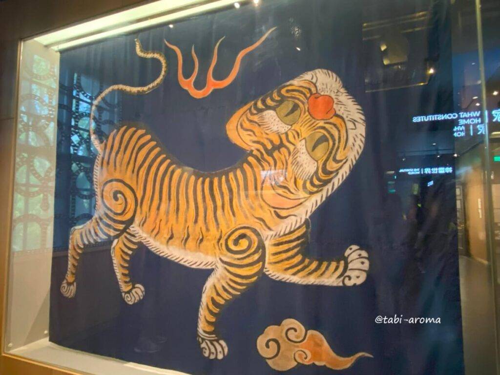 日清戦争の終了後、清国は台湾を日本に割譲しますが、その際、日本の統治に反対する勢力によって台湾民主国が樹立されます。結局は約5ヶ月で崩壊してしまうのですが、その時に作られたのが、この虎が描かれた国旗です。実物は日本側に戦利品として持ち運ばれ、皇居にある保存施設に保管されたそうです。この旗は、1909年に複製されものとか。