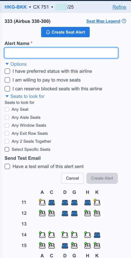 なお、 " Cerat Seat Alerts " をタップすると上記のオプションなどの部分は消え、座席表だけになります。