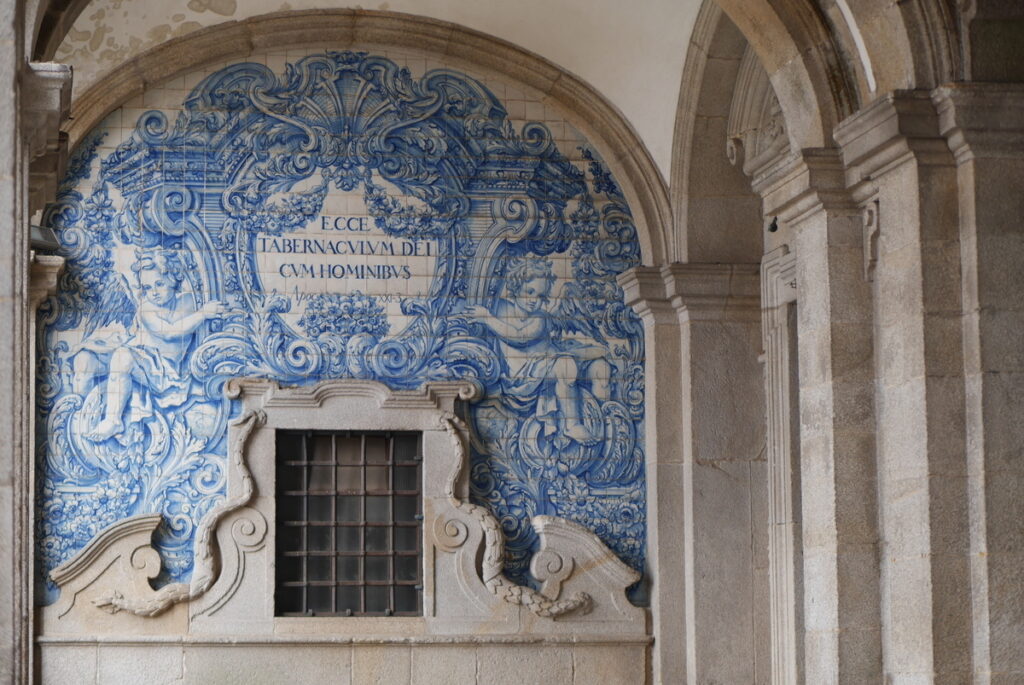 ファサードの外観や双塔はロマネスク様式ですが、ゴシック様式のバラ窓や回廊、礼拝堂が見られます。内部や回廊は、アズレージョで飾られています。