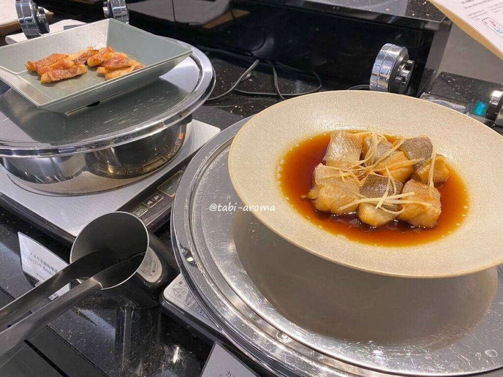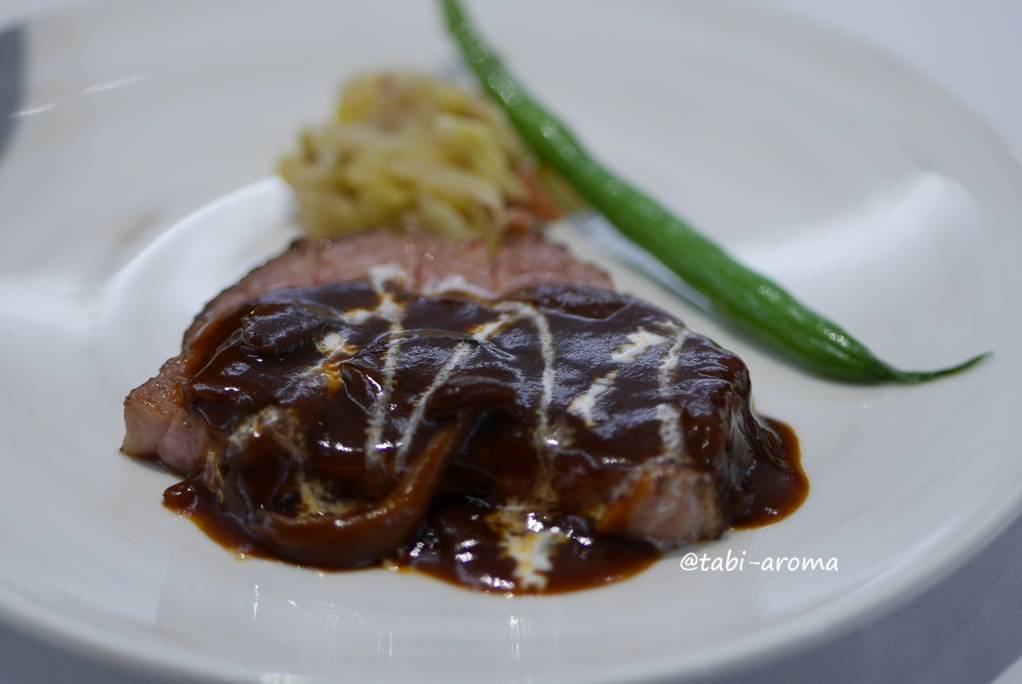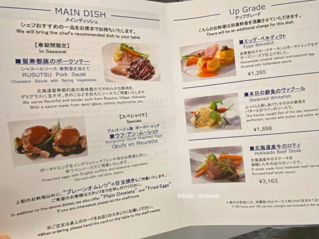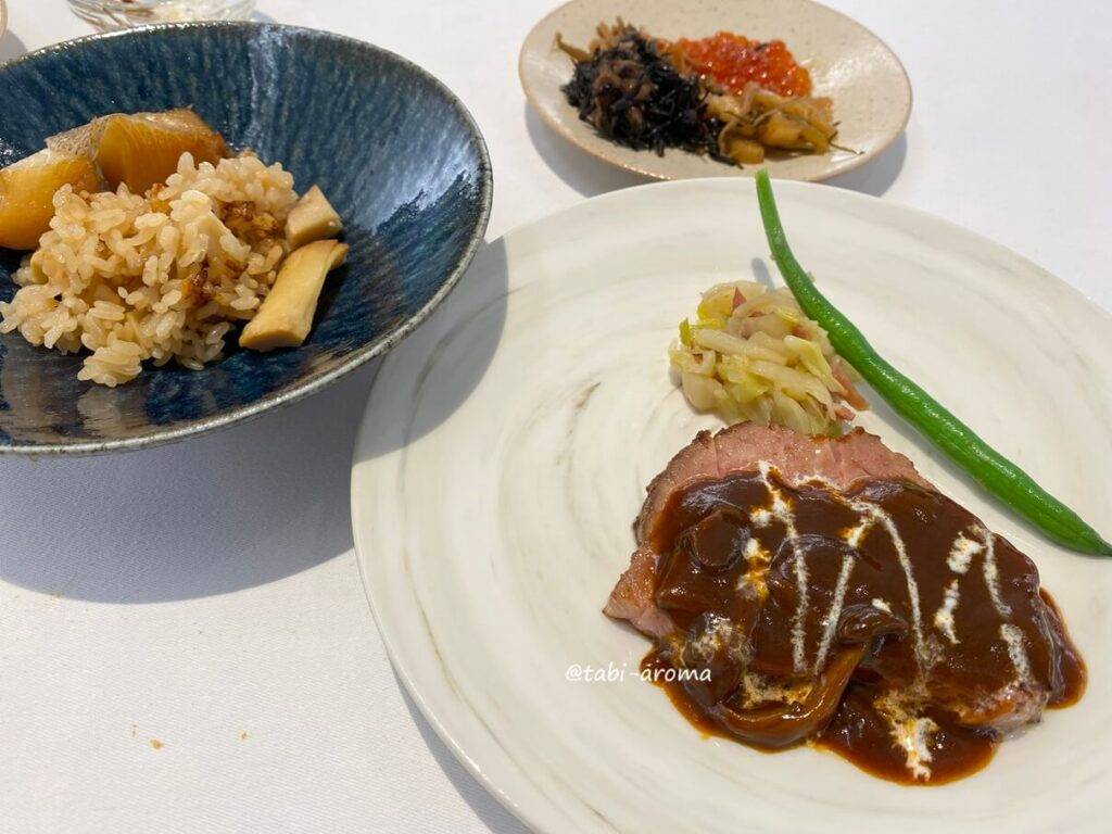洋食や和食のブッフェ形式の食事の他、メインディッシュも何種類かの中から選ぶことができました。メインディッシュは、出来立てを席まで持ってきてくれます。